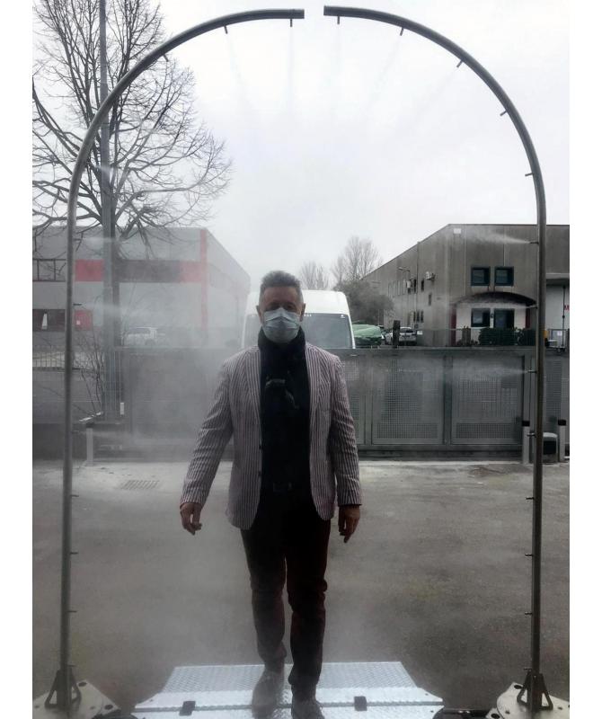 ADI es un sistema para la higienización de las personas a la entrada y salida de zonas sensibles al Coronavirus. Cuando la persona pasa, el sistema se pone automáticamente en servicio. Toda la persona que pasa entre los dos semi arcos es interesada en la nebulización, desde los pies hasta la cabeza, sin mojarse. Las micro gotas de 10 micrón entran en los poros de la roba de la persona que pasa, favoreciendo la eliminación de los Coronavirus presentes.