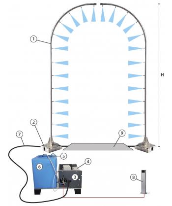 | Semi arcos n.2 semi arcos de AISI304 (código ZX.6002) con 26 boquillas diámetro ø10 (n.13 boquillas cada semi arco). Planchas n.2 planchas para el ajuste al suelo de los dos semi arcos, de AISI304. Módulo de bomba Electro bomba monofásica 60 bar 2 pistones , 1lt/m. Cuadro eléctrico + Programador Instalación eléctrica de mando con programación del tiempo de trabajo. Kit aspiración Kit para la aspiración del líquido en el tanque, con flotador para parada automática. Tanque estanque de 50lt por el esterilizante / detergente ya mezclado con agua. Kit manguera Kit manguera de poliamida (PA12SR), diámetro ø 9,6mm, largura 25mt, negro. Fotocélula Fotocélula con pedestal para la puesta en servicio automática del sistema. Planchas Planchas de plástico para la conexión al suelo de los 2 semi arcos. |