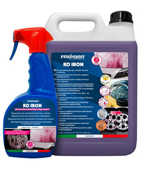 Ko Iron es un limpiador y descontaminante que elimina los residuos férricos y los minerales con un efecto visual especial diseñado específicamente por Fra-Ber para eliminar toda la contaminación depositada tanto en la carrocería como en las llantas de todos los medios de transporte (coches, camiones, furgonetas, etc.) difíciles de eliminar mediante los lavados clásicos y con los limpiadores de llantas tradicionales.
