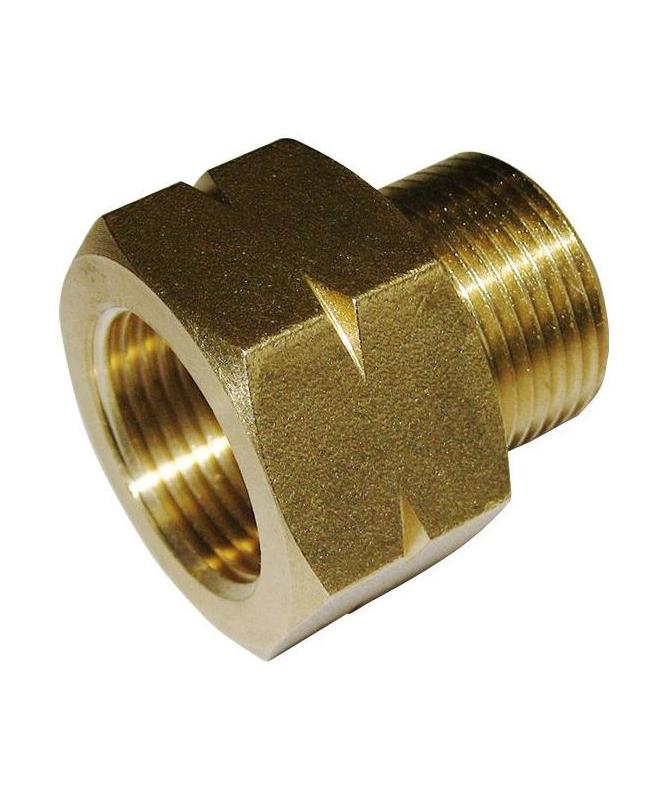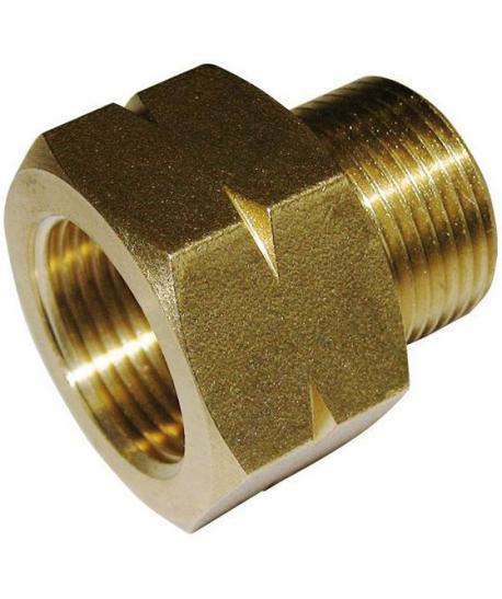 Adaptador para manguera, tipo Kärcher, de latón, entrada M22x1,5 H ø14 larga, salida M22x1,5 M ø14. Presión 220bar, temperatura máx. 150°C